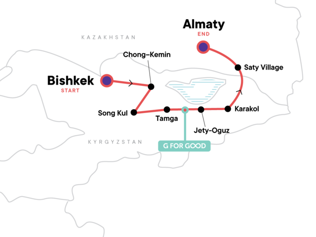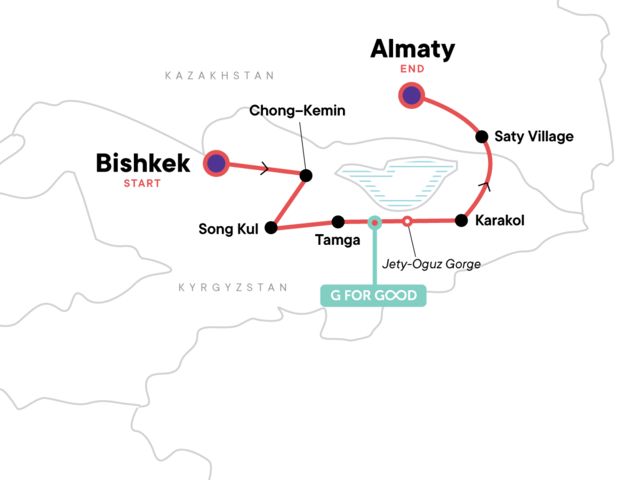 Your Local Living Moment: Tamga Village Stay, Tamga. Half-day city tour (Bishkek). Burana Tower visit. Felt-making workshop visit. Karakol city tour (half-day). Nikolai Przhevalsky Museum. Saty Village stay. Kaindy Lake and sunken forest exploration. Charyn Canyon stop. City tour (Almaty). Transport to/from all included activities and between destinations.